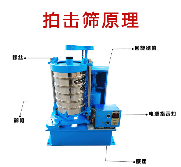 拍擊篩:拍擊篩 電機通過同步帶,帶動齒輪變速后使主軸轉動,主軸帶動偏心輪使滑板帶動試驗篩左右搖動,同時帶動頂桿齒輪轉動,頂擊拍錘,拍擊試驗篩,使試驗篩、分樣篩中的物料篩分。