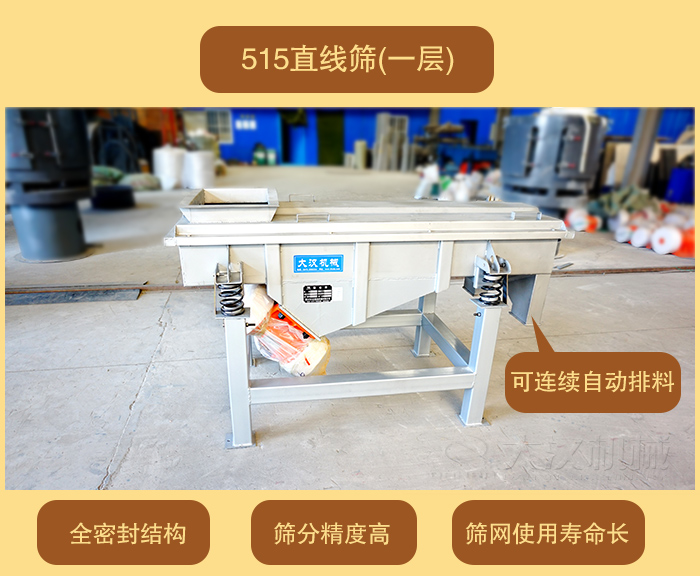 DZSF-515直線(寬)500mm×1500mm(長),體積小移動方便,價格便宜。大漢直線振動篩廠家可為客戶量身定做特殊要求的直線振動篩(單層或多層)。515直線振動篩按材質分為304不銹鋼材質和碳鋼材質。